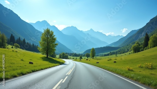 Scenic road through mountains and green fields.