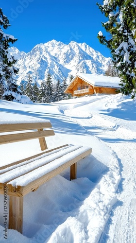 bench, snow, winter, mountain, tree, path, cabin, wood, trail, ski, blue, beauty, sight, remote, landform, calmness, clear, shadow, escape, scenic, snowflake, tranquil, slope, chilly, sunlight, snowy, peaceful, earth