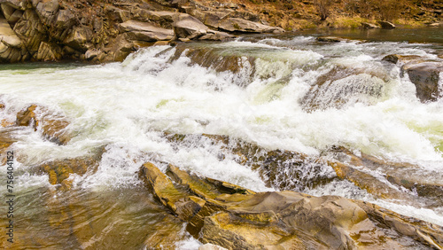 Scenic spring waterfall in Ukrainian Carpathians. Beautiful river flow among huge brown rocks