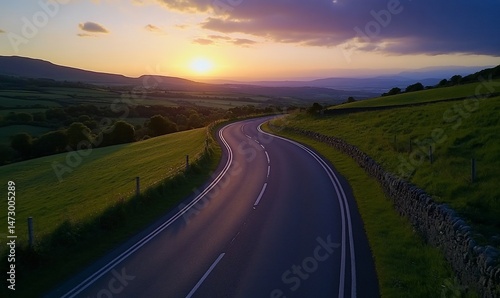 Scenic Sunset Over Winding Road Through Rolling Green Hills and Natural Beauty