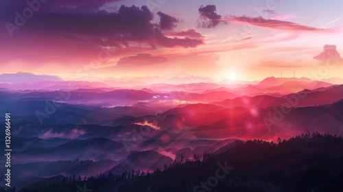 Scenic Sunset Overrolling Mountains and Misty Valleys at Dusk