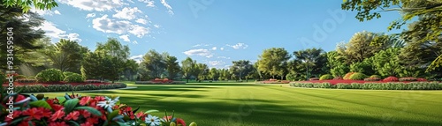 Scenic view of a city park, vibrant flowers and manicured lawns, ideal for travel brochures