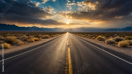 Scenic view of a long empty highway stretching toward distant mountains or desert. Warm golden light and open space evoke solitude, exploration, and the spirit of travel.
