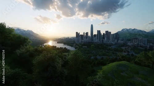 Scenic view of a modern city skyline at sunset, reflecting on a river, surrounded by mountains