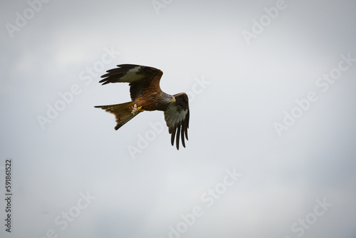 Scenic view of a red kite flying in the cloudy sky in Rhayader, Wales