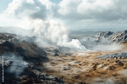 Scenic view of a rugged, foggy valley with steam rising from the ground, surrounded by mountains under a cloudy sky.