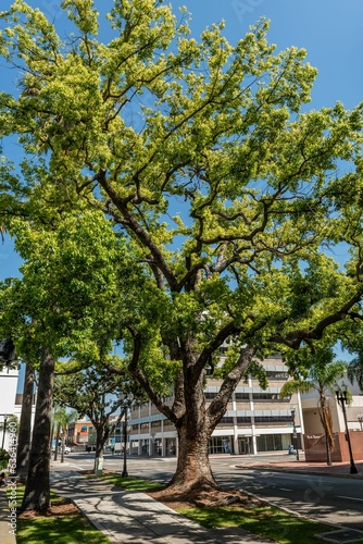 Scenic view, of a tree in the foreground, illuminated by a street light in the background