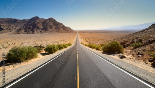 Scenic View of an Empty Asphalt Road Leading Through an Expansive Desert Landscape, Capturing Adventure, Serenity, and the Majestic Beauty of Open Roads Underneath a Vast Blue Sky