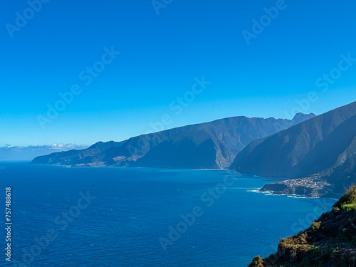 Scenic view of idyllic coastal towns build on rugged cliffs along coastline of Atlantic Ocean seen from Ribeira da Janela, Madeira island, Portugal, Europe. Mountain ridges rising from shoreline