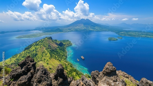 island, volcano, ocean, landscape, water, sky, sea, blue, mountain, tropical, view, nature, green, coast, horizon, cloud, bay, beach, rock, cliff, hill, shore, peak, crater, summit, chain, marin, aquatic, coral, reef, forest, vegetation, oceanic, aerial, panorama, photo