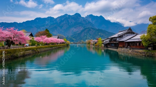 mountain, river, cherry, blossom, water, tree, sky, cloud, landscape, nature, calmness, beauty, spring, architecture, serenity, tour tourism, travel, outdoors, scenery, colourful, peaceful, environment, japan, culture, heritage, rural, vibrant, flora, greenery, picturesque, calm, scenic, vacation, exploration, journey, traditional, seasonal, historical, sunlight, foliage, relaxation