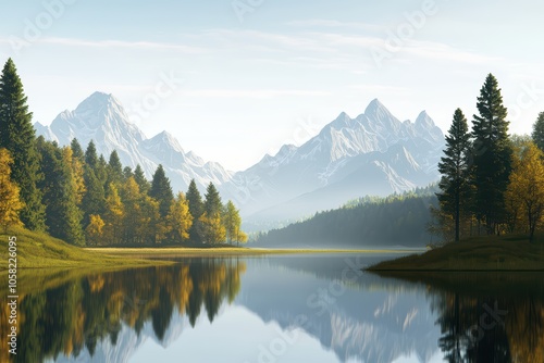 Scenic view of mountains reflected in a calm lake surrounded by lush trees and vibrant autumn colors.