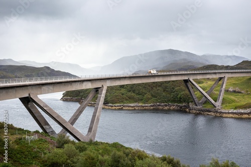 Scenic view of the Kylesku Bridge arching over a river in Scotland