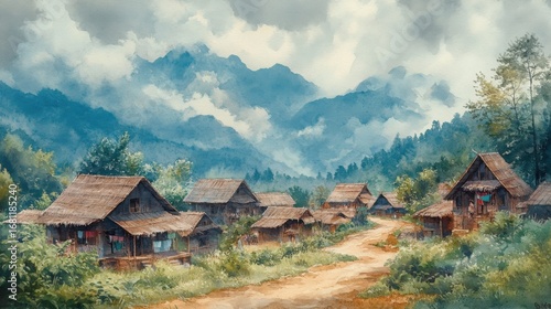 Scenic view of traditional wooden houses in a lush green village surrounded by mountains with misty sky in a watercolor painting style du daytime