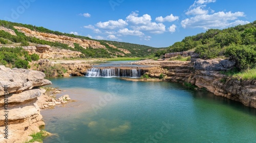 Scenic Waterfall and Blue Pool Landscape Under a Beautiful Cloudy Sky