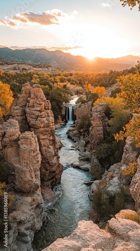 waterfall, canyon, sunset, autumn, foliage, mountain, view, landscape, rock, river, water, tree, nature, scenic, gold, distant, serene, sky, sunlight, cliff, vale, cascade, stream, wilderness, travel, tour tourism, geology, environment, beauty, vista, horizon, elevation, formation, landmark, destination, vacation, exploration, adventure, calmness, peaceful, idylli, picturesque, breathtaking, majestic, natural, wild, untouched