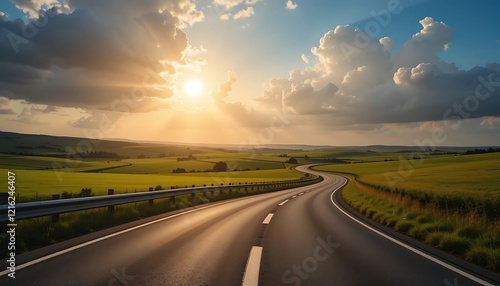 road, sunset, countryside, landscape, winding road, scenic, beautiful, nature, summer, cloud, sun ray, highway, asphalt, travel, journey, open road, driving, sky, horizon, way, speed, cloud, empty, car, field, rural, country, street, sun, desert, grass, line, route