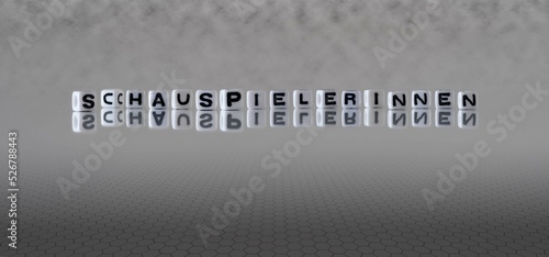 schauspielerinnen Wort oder Konzept dargestellt durch schwarze und weiße Buchstabenwürfel auf einem grauen Horizonthintergrund
