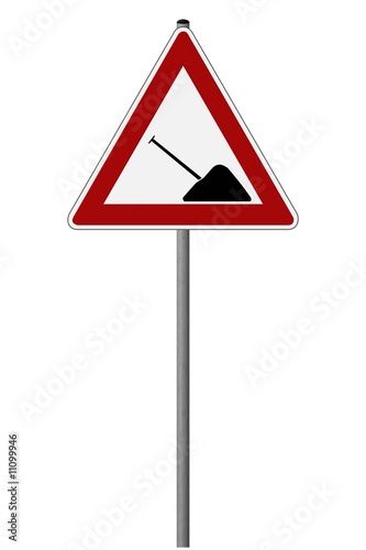 roadsign, road traffic, lettering, supplement, break, strike, word, text, blank, free, pure, construction, under construction, plate, working man, warning, hint, information, stab, metal, sheet, plate, reflector, steel, grey, silver, red, white, black, mountain, heap, bucket, job, communication, additive