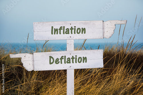 inflation, deflation, roadsign, plate, signpost, money, economic, raise, price, purchasing power, reduction, financial crisis, european, bench, currency, stable, stability, consumer, cost of living, intake, euro, hyperinflation, value, progression