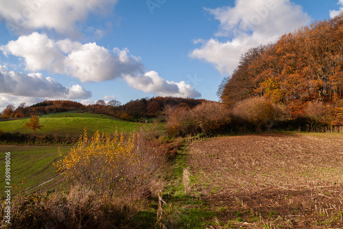 schöne Hügel und Feldlandschaft in bunten Herbstfarben
