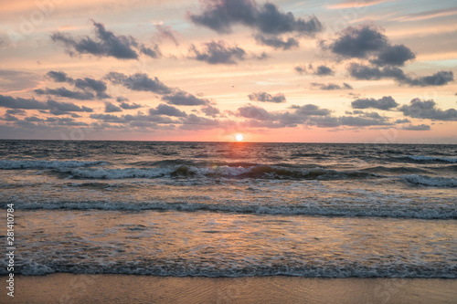 Schöne Ozeanlandschaft mit Sonnenuntergang in den Niederlanden, Strand, Meer, Sonne über Skyline, Horizont, warme Farben