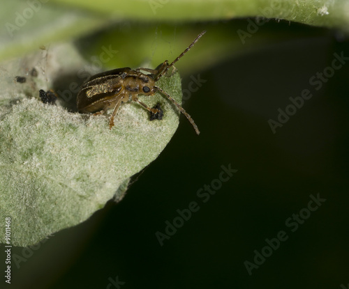 Schneeballblattkäfer (Pyrrhalta viburni) auf Blatt des Gewöhnlichen Schneeballs (Viburnum opulus), Mecklenburg-Vorpommern, Deutschland