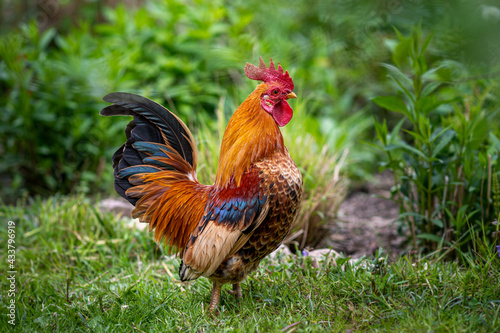 faucet, fowl, farm, organic, nature, bantam, horizontal, animal, grass, farming, fret, plumage, beak, domestic, rural, green, food, crest, colourful, field, brown