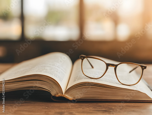 scholarly scene featuring open book and glasses on wooden table