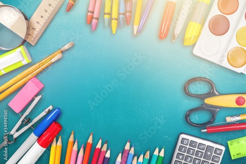 school, supply, bright, elementary, red, apple, back, back to school, blue, blue background, book, chalk, colours, concept, copy, wax crayons, creativity, design, draw, education, equipment, eraser, kindergarten, learning, letter, modern, note, notebook, office, paint