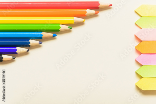 accessory, background, colourful, merging, complete, learn, line, paper, rainbow, ready, row, school, stick, study, table, topview, white