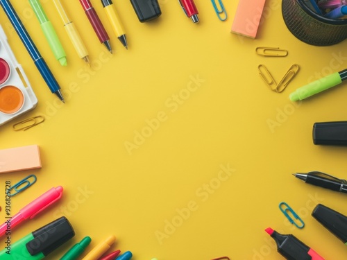 collection, school, office, supply, bright, yellow, academic, accessory, essential, scattered, educational, gear, stationery, learning, colourful, tool, preparation, setup, resource, vibrant, study, classroom, desk, stationary, diverse, material, topview, variety, workspace, pen, notebook, paper clip, ruler, creative, organised, professional, equipment, background, assortment, surface, item, education, back to school, school supplies, office supply