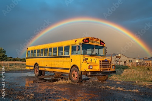 school bus, school, rainbow, rainy day, transportation, education, weather, cheerful, nature, vivid colors, community, childhood, happy, cloud, city landscape, scenic view, safety, joyful, bright, rainbow colours, road, urban area, peaceful, public transport