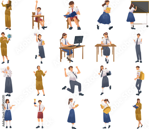 character, illustration, school, vector, cartoon, study, student, flat, graphic, design, set, collection, person, university, element, concept, line, trendy, doodle, element