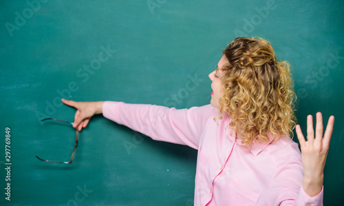 School lesson knowledge. Remember this. Strict woman teacher pointing at chalkboard. Informing kids. School rules. School principal stressful outraged expression. Educational system concept