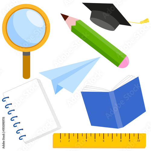 homework, school, crayons, notebook, book, equipment, supply, vector, tool, college, ruler, paper, plane, paper plane, magnifying glass, notepad, mortarboard, graduation, magnifier, student, preschool, illustration, education, study, elementary