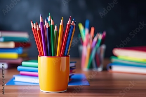 School supplies are on the table. Colored pencils and a stack of books on the desk, school board in the background