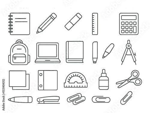 school, supply, educational, flat, icon, notebook, crayons, ruler, calculating machine, backpack, laptop, book, pen, compass, file, binder, protractor, glue, scissors, paper clip, stationery, learning, tool, office, education, study, kit, essential, item, equipment, design, minimal, outline, style, monochrome, simple, modern, illustration, art, graphic, symbol, template, vignetting, draft, line, clean, basic