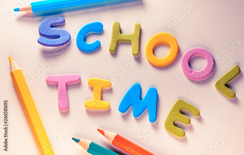School time words over a kid's school desk. Suitable for back to school activities , The first day of classes, office or end of vacations or Kids concepts.