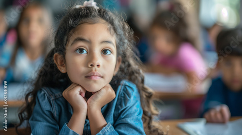 Schoolgirl with focused expression in blurred classroom background
