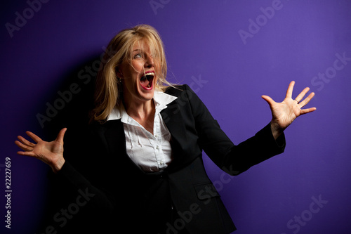business, woman, yelling, fear, shock, female, blond, clerk, purple, wall, shadow, rock, dress, costume, blouse, attractive, expression, surprise, stress, gesture, scream, apprehensive, 30, long-haired
