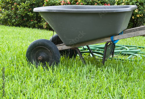 wheelbarrow, garden, gardening, home, allotment, care, cultivate, grass, work, green, waste, compost, nature, plant, transport, hose, pour, maintenance