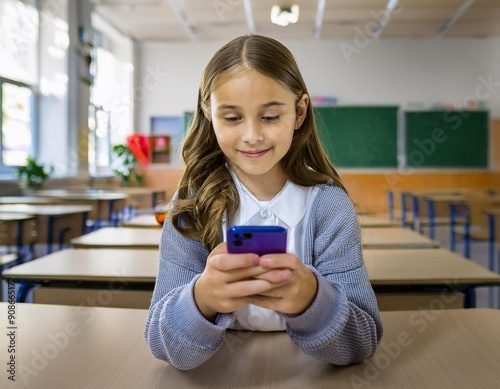 Schülerin in einer Klasse lächelt und tippt am Smartphone oder handy. Lernen