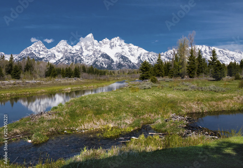 grand teton national park, grand teton, national park, shadow, river, mountain, evergreen tree, forest, snow-capped, mountain peak, cloud, idylli, no people, grass, ripple, travel
