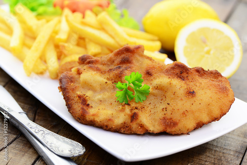 chips, meat, pork, french fries, french fries, french fries, food, lemon, main course, wiener, salad, pig, parsley, fries, fried, dish, main course, potato, potato, meal, dinner, kind, calf