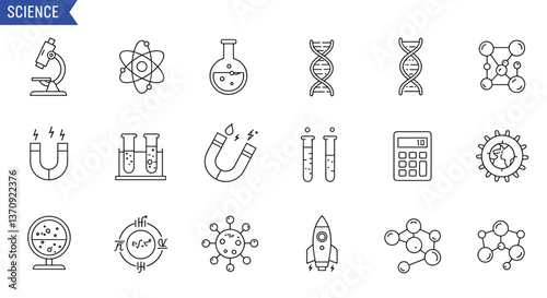 science, icon, microscope, atom, deoxyribonucleic acid, test, tube, magnet, calculating machine, molecular, chemistry, physics, biology, research, experiment, technology, education, illustration, graphic, design, vector, simple, line, minimal, white