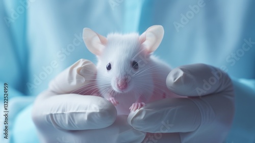 Scientist holding a small white laboratory mouse with red eyes in a blue rubber glove