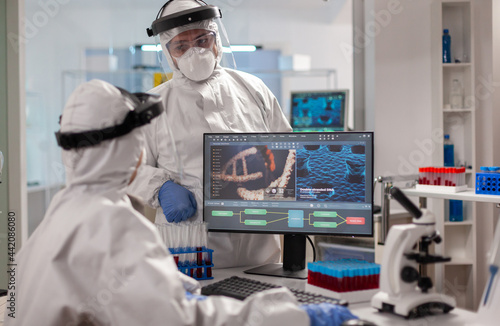Scientist team in prorection suit discussing treatment in front of pc looking at virus development. Team doctors working with various bacteria, tissue and blood samples, pharmaceutical research for