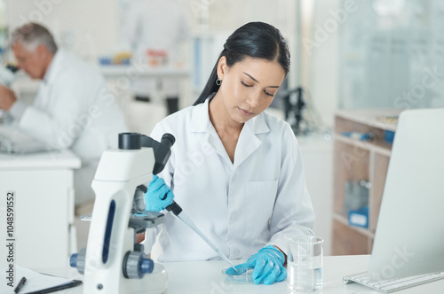 Scientist, woman and petri dish with dropper and medical research in clinic laboratory. Chemistry, microscope test and hospital for vaccine and science with ppe gear for virus and medicine study
