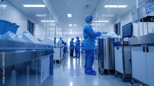 Scientists in laboratory working with equipment, wearing protective gear, conducting research under bright lights, modern facility.